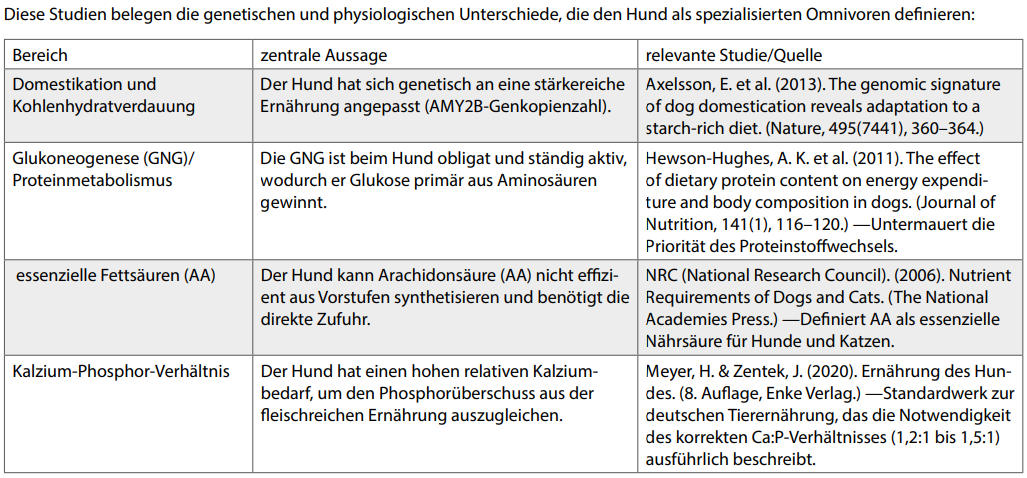 Der Mensch hingegen nutzt die GNG zwar auch, aber hauptsächlich als „Notfallplan“ oder bei bewusstem Weglassen von Kohlenhydraten in der Diät. Die Hauptenergie und Glucose stammen in der Regel direkt aus den Nahrungskohlenhydraten. Zusammenfassend kann gesagt werden, dass die Glukoneogenese beim Hund ein Grundmechanismus ist, der seine carnivore Vergangenheit widerspiegelt und die hohe Toleranz gegenüber einer kohlenhydratarmen, proteinreichen Ernährung erklärt.