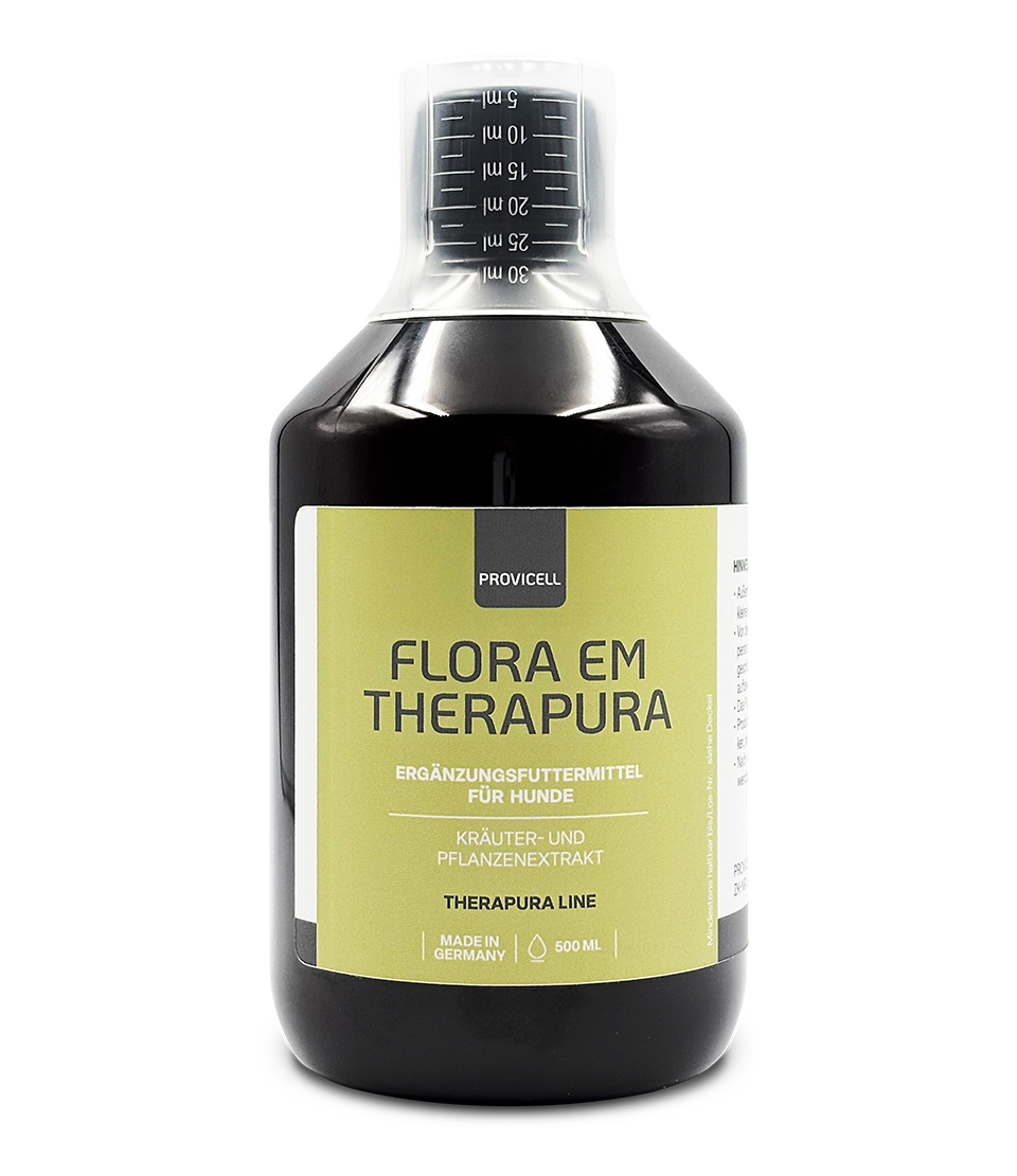 Flora EM Therapura ist ein natürlich fermentiertes, flüssiges Ergänzungsfuttermittel für Hunde. Es kombiniert 21 fermentierte Kräuter- und Pflanzenextrakte mit einer Vielfalt an Mikroorganismen – eine besondere Komposition, die sich gut in naturorientierte Fütterungskonzepte einfügt.